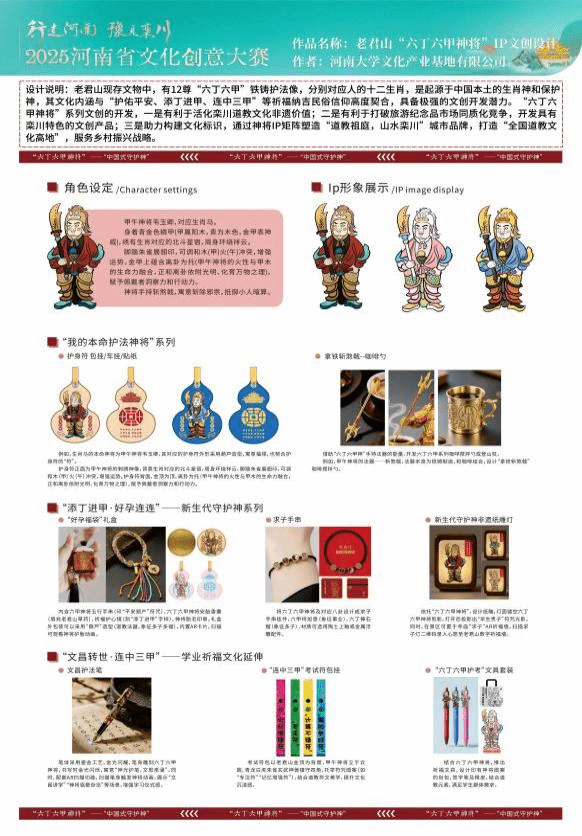 作为高校文化创意产业的优秀代表,河南大学文化产业基地有限公司(河南大学文创中心)延续“文化传承+创新表达”的核心创作理念,在“道教‘六丁六甲神将’文创开发方案——‘中国人的保护神’IP及文创设计”文创方案设计之初,就深入挖掘和解读中国道教名山——老君山独有的地域文化特色,将老君山现存文物“12尊‘六丁六甲’铁铸护法像”中有关“护佑平安、添丁进甲、连中三甲”的文化内涵,创新表达为“我的本命护法神将”“添丁进甲·好孕连连”“文昌转世·连中三甲”三大核心主题。这一独特创意在活化栾川非遗价值、塑造栾川城市品牌、开发栾川特色文创等方面具有首创精神。