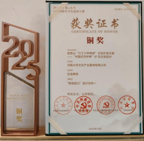 10月29日,由河南省文化和旅游厅、中共河南省委宣传部、中共河南省委网络安全和信息化委员会办公室、河南省教育厅联合主办的2025河南省文化创意大赛成果发布仪式暨优秀获奖作品展举行。河南大学文化产业基地有限公司(河南大学文创中心)参赛作品“道教‘六丁六甲神将’文创开发方案——‘中国人的保护神’IP及文创设计”在全省153所高校及两百余家企业、设计机构的1.5万余件作品中脱颖而出,成功斩获铜奖。