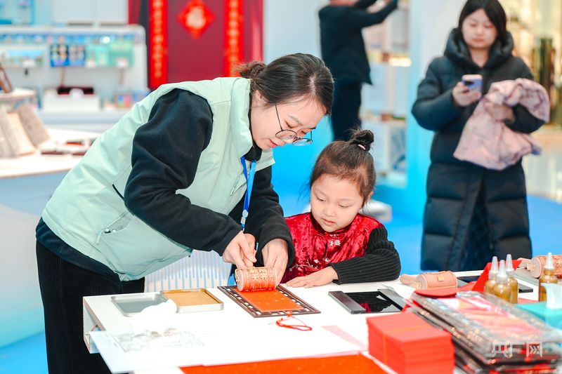 展览现场,市民除了可进行木版年画制作、拓印“魁星点斗(寓意马上登科)”等吉祥词语到红包上等非遗文化场景体验外,还可以进行金榜题名状元帽打卡、互动获取北宋交子货币、为亲人手写祝福等体验活动,将传统福文化与新春美好寓意融入互动体验,让市民在集章打卡中感受年味、传递祝福。