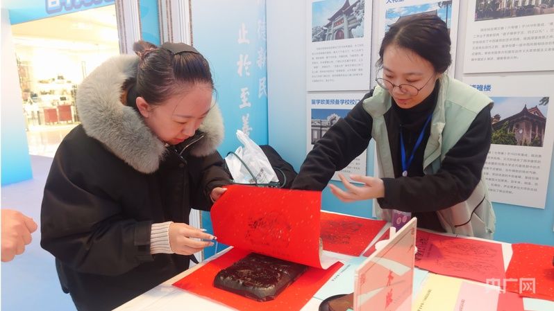 小朋友在工作人员的指导下拓印红包上的吉祥词语(央广网发 河南大学文创中心供图)