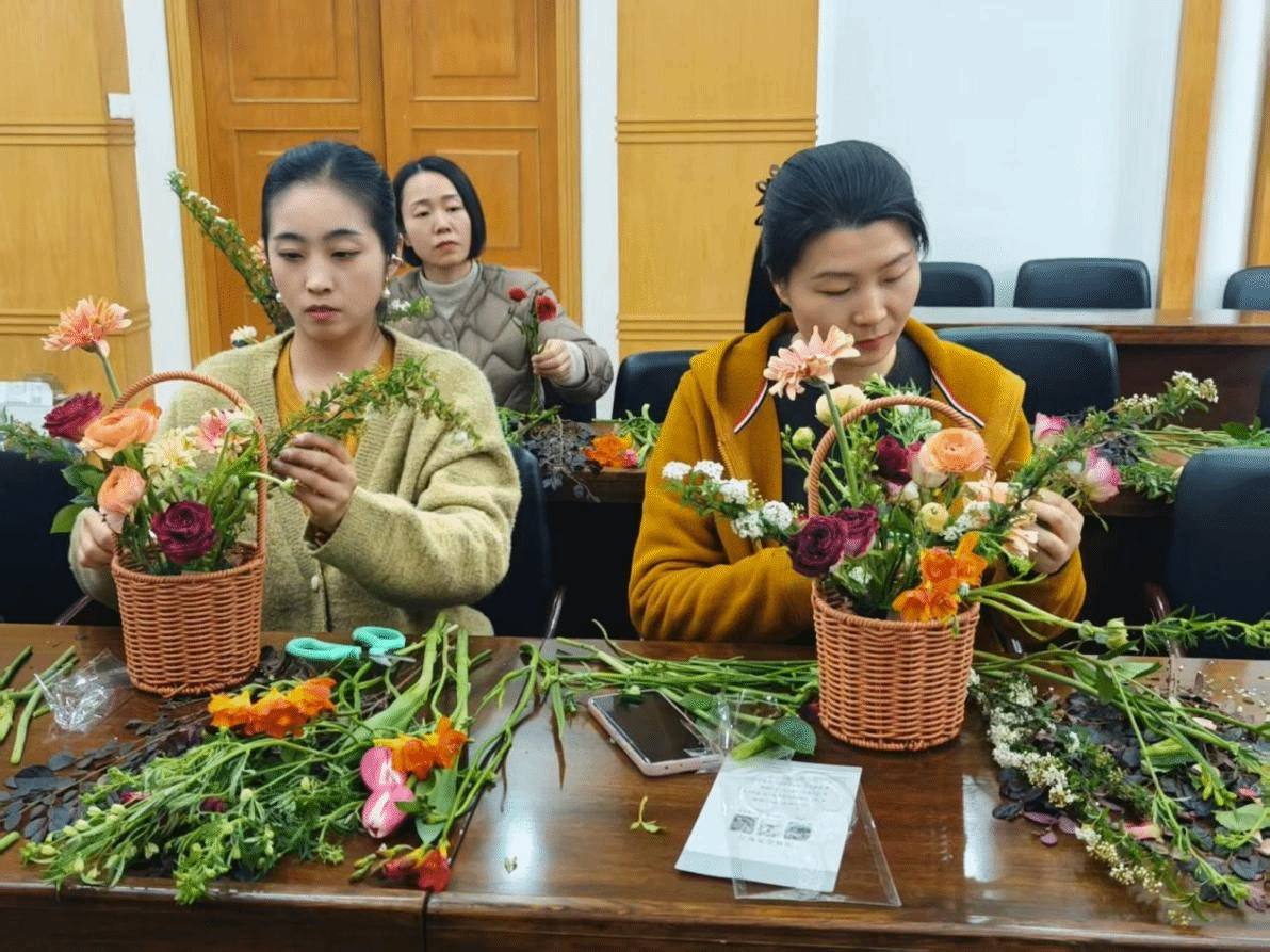 活动当天,出版社被装点得温馨雅致,空气中弥漫着鲜花的清甜香气,各色花材整齐地摆放在长桌上,仿佛一幅鲜活的春日画卷。