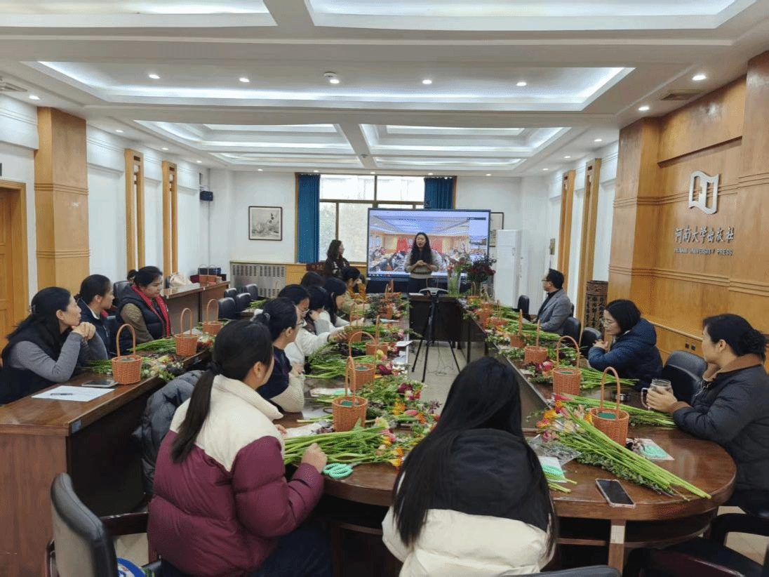 三月春风拂面,百花次第盛开。在国际劳动妇女节到来之际,为丰富我社女职工的精神文化生活,传承中华优秀传统文化,营造出版社团结和谐的文化氛围,河南大学出版社于2026年3月6日在开封、郑州两地同时举办了“悦己悦生活”主题花艺沙龙活动。出版社工会主席陈林涛代表社工会为女职工们送上节日的问候与祝福。